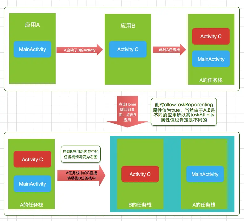特别地,如果我们的应用中引用到了其他应用的Activity,这些Activity设置了android:allowTaskReparenting属性为“true”,则它们会被重新宿主到有共同affinity的task中。