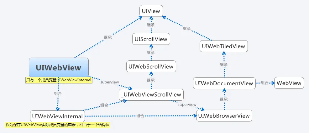 通过反编译可以获得UIWebViewInternal的具体成员变量@interface UIWebViewInternal : NSObject { UIScrollView *scroller; UIWebBrowserView *browserView; UICheckeredPatternView *checkeredPatternView; id delegate; unsigned int scalesPageToFit; unsigned int isLoading; unsigned int hasOverriddenOrientationChangeEventHandling; unsigned int drawsCheckeredPattern; unsigned int webSelectionEnabled; unsigned int drawInWebThread; unsigned int inRotation; NSURLRequest *request; int clickedAlertButtonIndex; UIWebViewWebViewDelegate *webViewDelegate; UIWebPDFViewHandler *pdfHandler; } @end