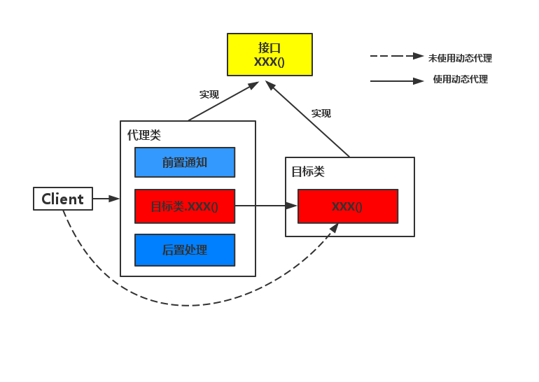 使用代理模式必须要让代理类和目标类实现相同的接口,客户端通过代理类来调用目标方法,代理类会将所有的方法调用分派到目标对象上反射执行,还可以在分派过程中添加"前置通知"和后置处理(如在调用目标方法前校验权限,在调用完目标方法后打印日志等)等功能。