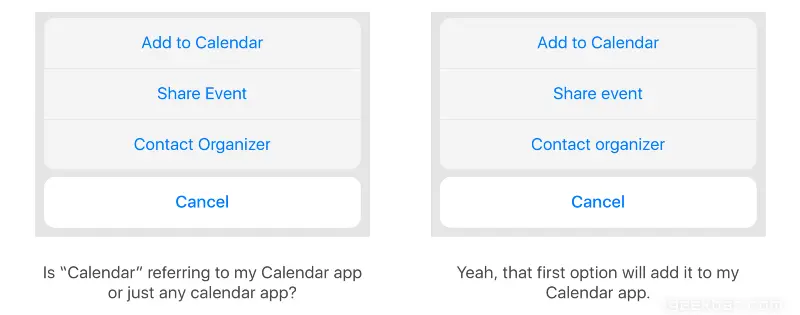 很多公司命名的时候会使用一个描述性的名字(比如“Inbox”、“Calendar”),而不是特殊的词(比如“Spark”、“Fantastical”)。如果在所有按钮中使用title case,很难分辨某个词是否是专有名词,以影响可用性。