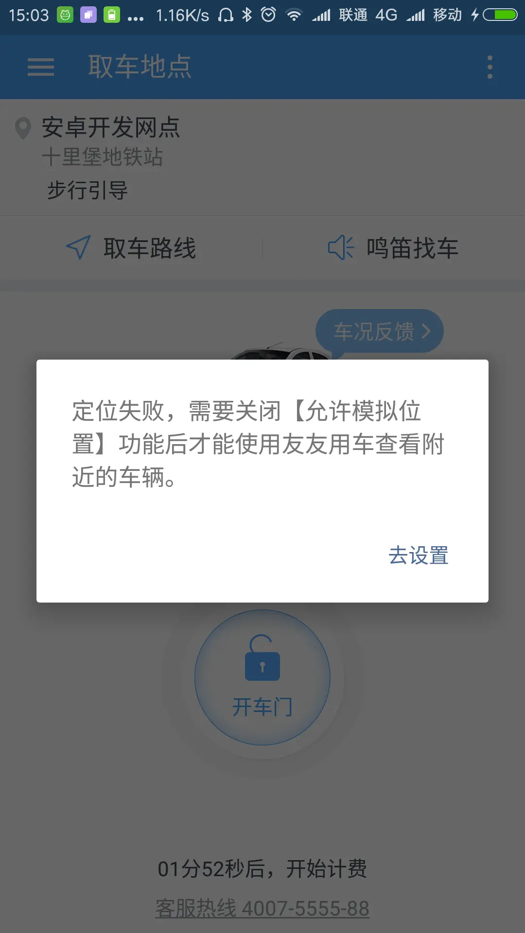 在开车门页面中,点击开车们按钮,判断用户是否打开了模拟位置开关,若打开则提示用户关闭: