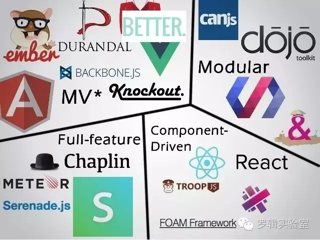 这个是我找到的一张图,是一些最近几年出现的前端框架。左上角的有Angular、Ember、BackBone、Knockout,还有今天即将安利的Vue;这里其他位置我认识的还有Meteor,感觉它是非常未来的框架,实时的特性非常excited,还有右上的Polymer、React。