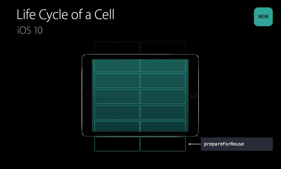 在iOS 10 当中,系统会把cell保持一段时间。在iOS中,如果用户把cell滑出屏幕后,如果突然又想回来,这个时候cell并不需要再走一段的生命周期了。只需要直接调用willDisplayCell就可以了。cell就又会重新出现在屏幕中。这就是iOS 10 的整个UICollectionView的生命周期。