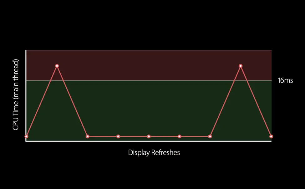 我们换种方式在说明一下2种情况下掉帧的情况。我们用下图的标准来衡量一下上面2种情况。下图分为2部分,上面红色的区域,就是表示掉帧的区域,因为高于16ms。红色和绿色区域的分界线就在16ms处。y轴我们表示的是CPU在主线程中花费的时间。x轴表示的是在用户滑动中发生的刷新事件。