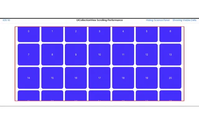我们先来看一下之前 UICollectionView 的体验,假设我们每个cell都是简单的蓝色,实际开发app中,cell会比这复杂很多。 我们先生成100个cell。当用户滑动不是很快的时候,还感觉不出来卡顿,当用户大幅度滑动,整个UICollectionView的卡顿就很明显了。如果整个cell的DataSource又是从网络加载的,那就更加卡顿了。效果如下图。
