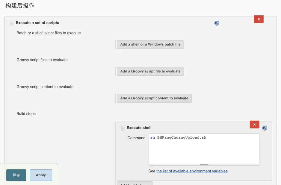 这里我们选择Execute a set of scripts,这里也是一个脚本,这个脚本用来上传自动打包好的ipa文件。脚本在第四章节有详细的讲解。