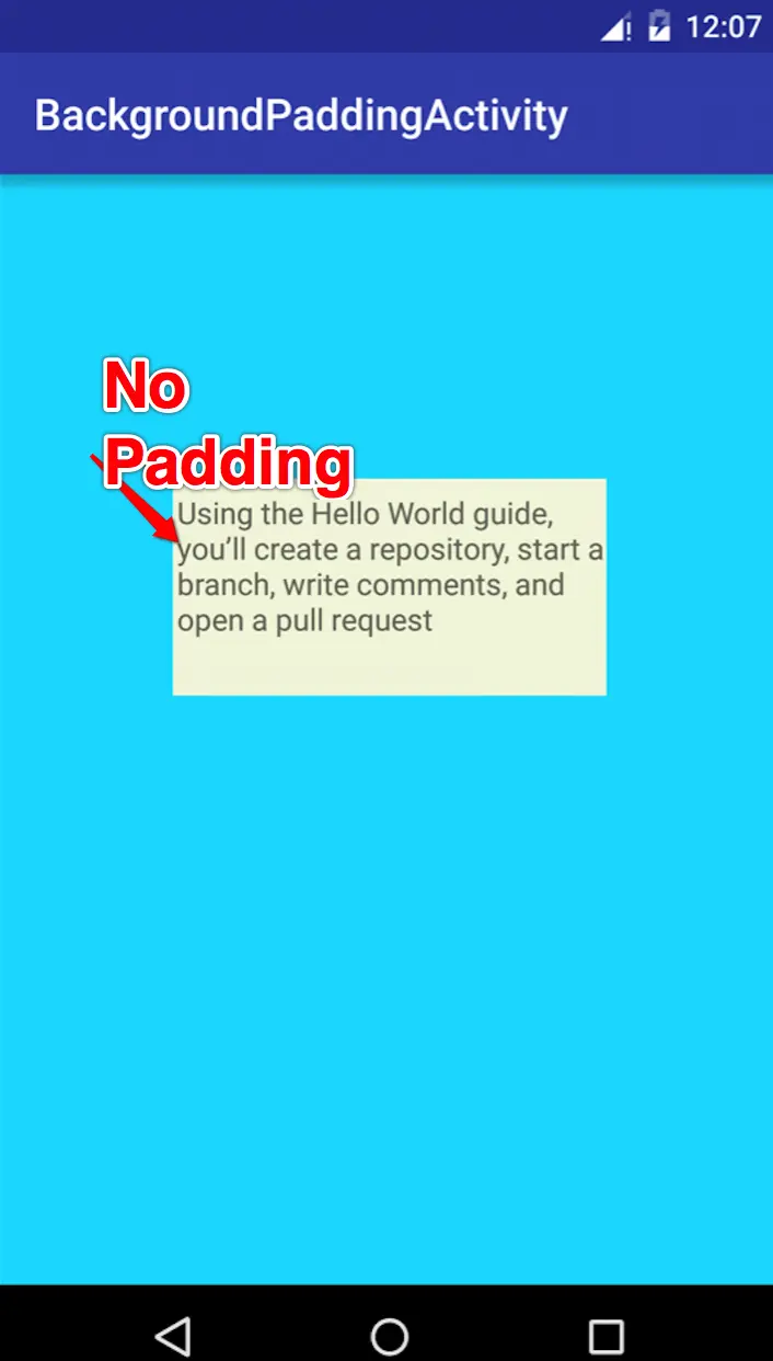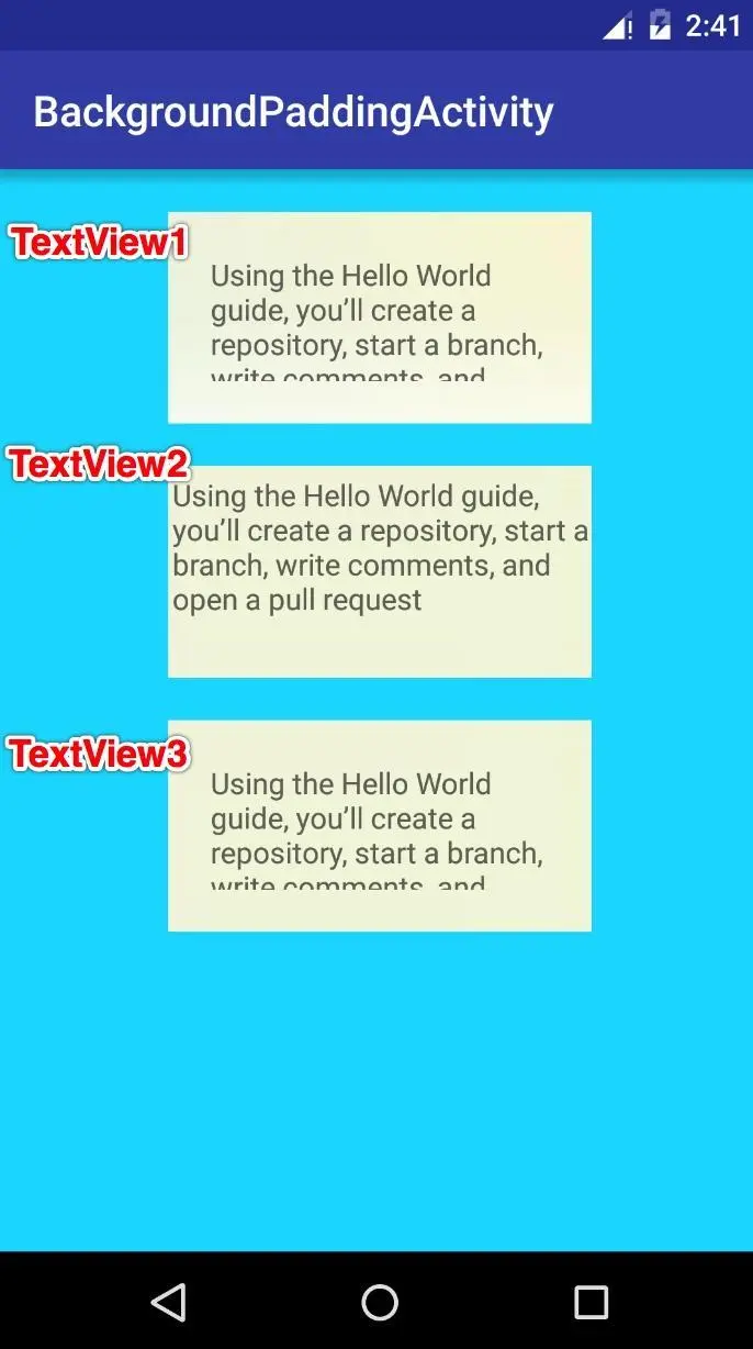 那么我们来验证下我们的分析, 做一个Demo, 有三个View, 第一个使用png的普通背景, 第二个使用有padding的.9图片, 第三个使用无padding的.9图片.