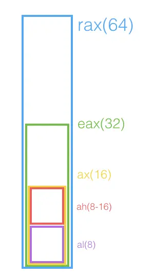 将刚才 4 字节长度内存赋值给 %eax 寄存器,它是最常用的通用寄存器之一,名为 accumulator,在 64 位架构下,rax 表示这个寄存器的完全体,eax 表示它的低 32 位,ax 表示低 16 位,ah 表示第 8~16 位,al 表示最低的 8 位。这样抠门的设计一部分因为兼容历史的 32 架构,一方面也是为了更充分利用寄存器这个宝贵的资源: