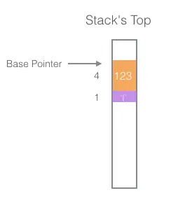 move 指令就是简单的值拷贝,这条指令中出现的 movl 表示按低 32 位的长度来拷贝(也就是一个 int 的长度),与之相似的还有 8 位的 movb(char)、16 位的 movw (short)、64 位的 movq (long in 64) 等;$123 即字面常量值;-4(%rbp) 代表 base pointer - 栈基地址寄存器,偏移 4 字节的位置。这个指令执行后内存如下所示: