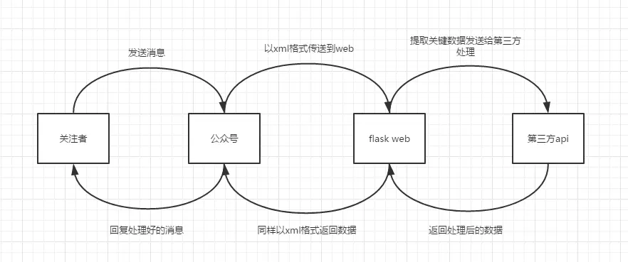 - 公众号发送和回复的消息格式都是xml格式,开发者文档中有具体的解释,发送和接收消息格式如下,然后使用python中的xml.etree.ElementTree提取数据,传递给第三方调用的API,处理后返回值,再继续转化成xml格式经web响应返回给微信。