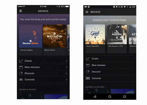 Spotify is a well-known music streaming app that has stylized design and strong brand identity. While Spotify’s designers made a significant efforts to maintain the brand’s integrity, they also follow the platform’s design guidelines to design some specific app features.