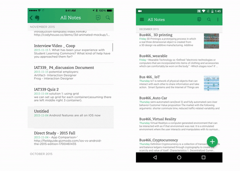 Evernote’s designers also adopted native UI elements on each platform to perform same tasks. As you can see from the graph 2.6, the add button on android is float button, which is a traditional UI element on material design. On the other hand, the add button on iOS is action bar button, which is usually seen in the iOS design guideline.