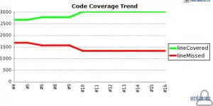 (3)配置好了之后进行构建,构建完成之后job首页就会出现覆盖率的趋势图(图1-4),鼠标点击趋势图可以看到覆盖率详情(图1-5) ,包括具体覆盖率数据和源码的覆盖率情况: