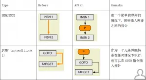 一个用java字节码定义的java方法的控制流图可能有以下的type,每一个type连接一个源指令与目标指令,type不同探针的注入策略也会不同,如下是type定义: