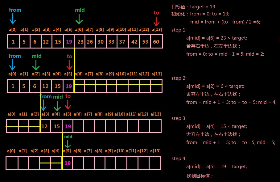 因为a[mid]处在数组的中间位置,所以它的左侧或者右侧都是数组的一半,这样每一次我们通过a[mid]和target的比较就可以排除掉一半的数据。最后只有两种情况,要么我们找到了目标值,要么我们排除了所有数据没有找到目标值。