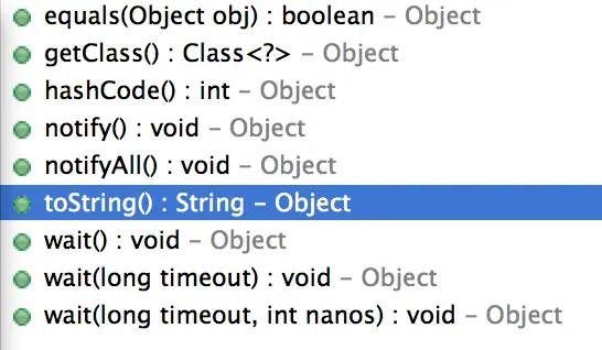 在Java中,所有类都有一个父类,即使没有声明父类,也有一个隐含的父类,这个父类叫Object。Object没有定义属性,但定义了一些方法,如下图所示:
