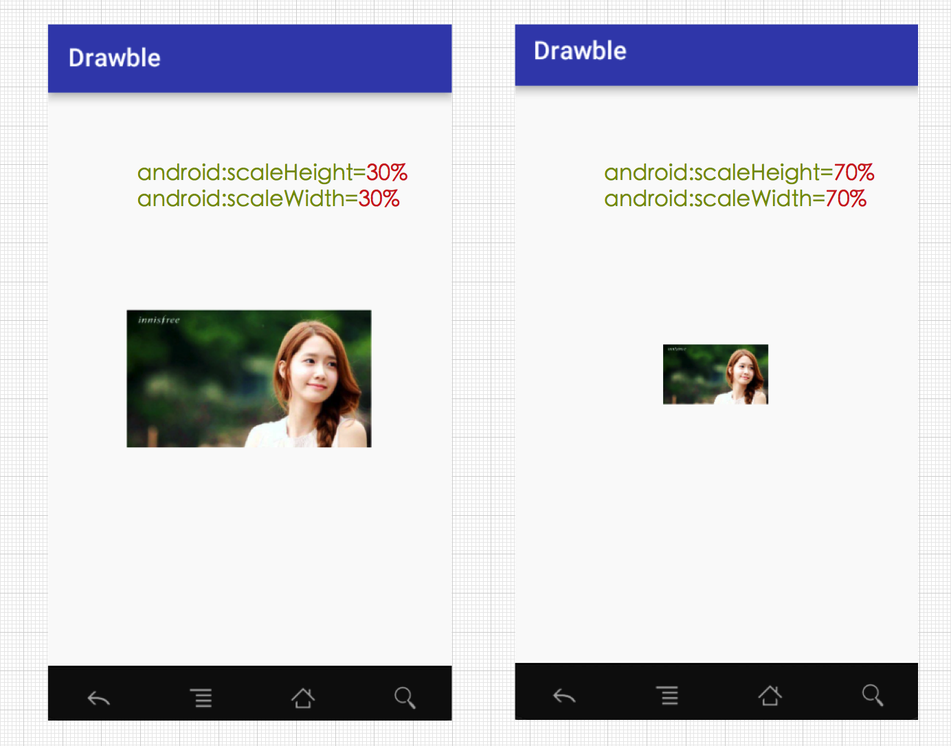 表示Drawable的高的缩放比例,值越大,内部Drawable的高度显示得越小,例如android:scaleHeight=”70%”,那么显示时Drawable的高度只有原来的30%。