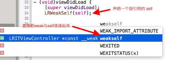 #define LRWeakSelf(type) __weak typeof(type) weak##type = type;##是连接的作用, 即当使用上面的宏会把weak与输入的type值连接起来如下图: