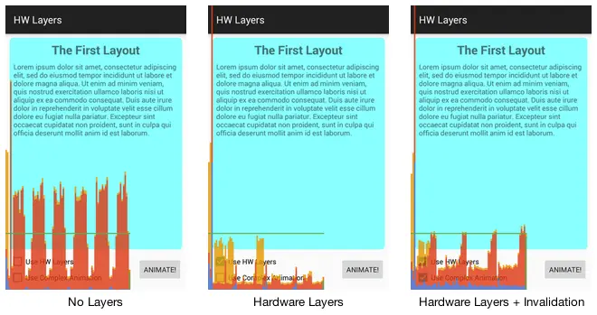 The third case shows the danger of invalidation during an animation with hardware layers. A lot of the performance gains are killed due to bad usage of hardware layers.