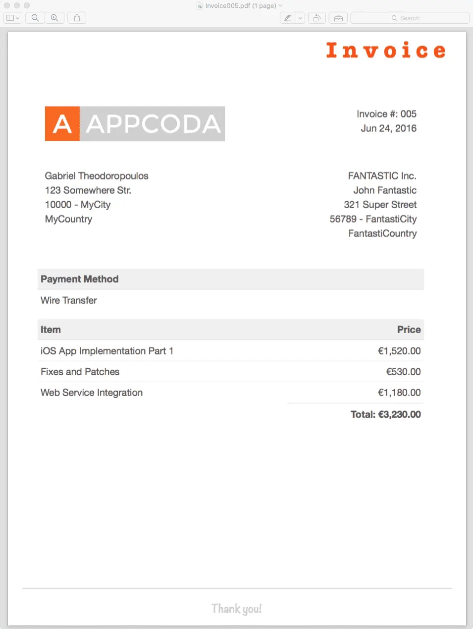 现在让我们来对打印结果做一些拓展,添加页眉和页脚。这也是为什么在前面我会自定义一个UIPrintPageRenderer类。我们所说的打印内容,除了使用HTML模版生成部分还包括页眉和页脚。我们会在右上角添加"Invoice"作为页眉、下方添加“Thank you!”作为页脚。最终效果如下图: