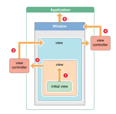 - 项目中多个页面实现了点击状态栏页面滑动到顶部的功能,实现方法无非就是先获取到点击状态栏时的事件,由于AppDelegate继承自UIResponder,所以能够响应事件,作为响应者链最顶层(响应者链如下图所示)的响应者,当前面的Responder无法处理事件而向上传递时,最后会到达AppDelegate,所以统一在AppDelegate中处理状态栏的点击,直接重写