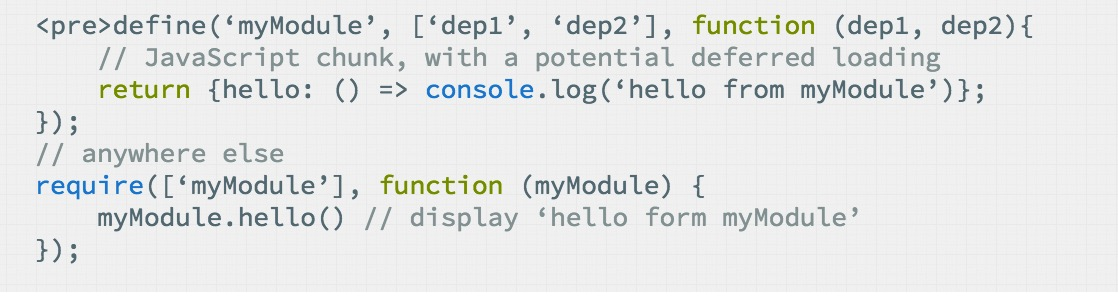 AMD (异步模块依赖) : Require.js 很受欢迎,它可以给模块注入依赖。另一个优点就是允许动态加载 JS 块。
