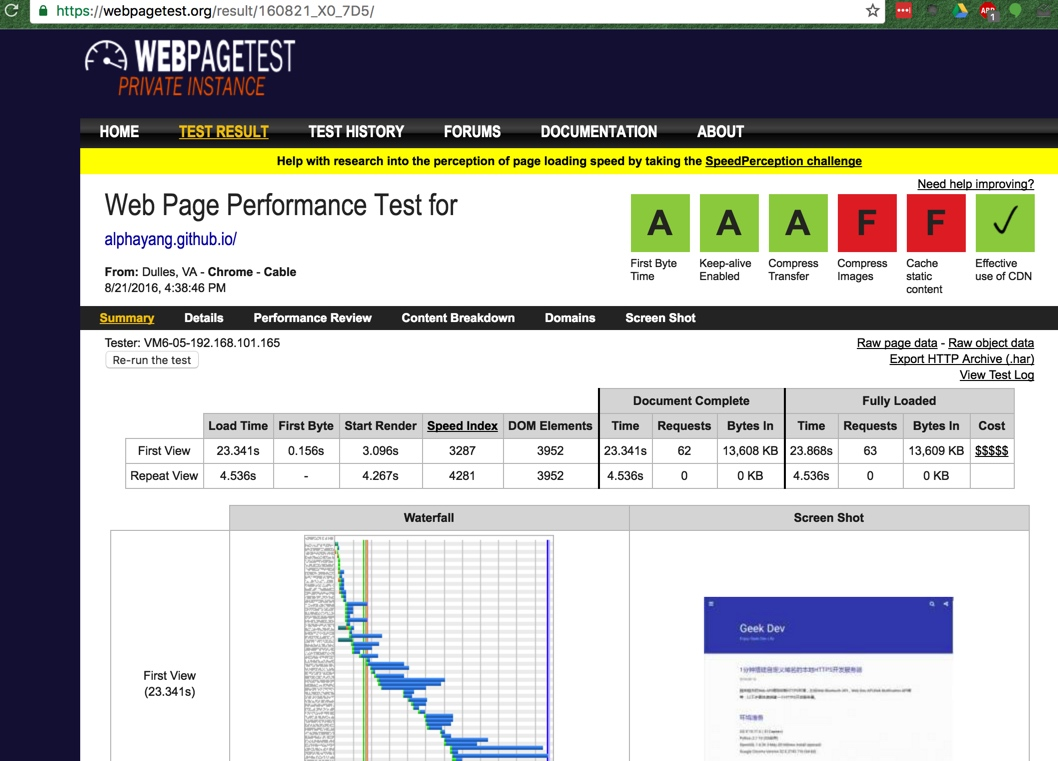 WebPageTest是一个在线服务,可以指定不同的浏览器版本和所在地,进行测试并提供详细的加载时间报表,用来优化页面访问。