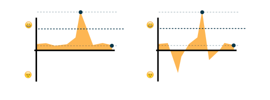 举个例子,下面的体验侧写大致是一样的,除了其中之一有一个意外的负面体验。你可以想象,设计者的注意力肯定会放在解决这个问题,而不是创造高潮时刻上。这固然会提高可用行,不过也使整个体验变得单调乏味,很容易受到未预见的问题的影响。