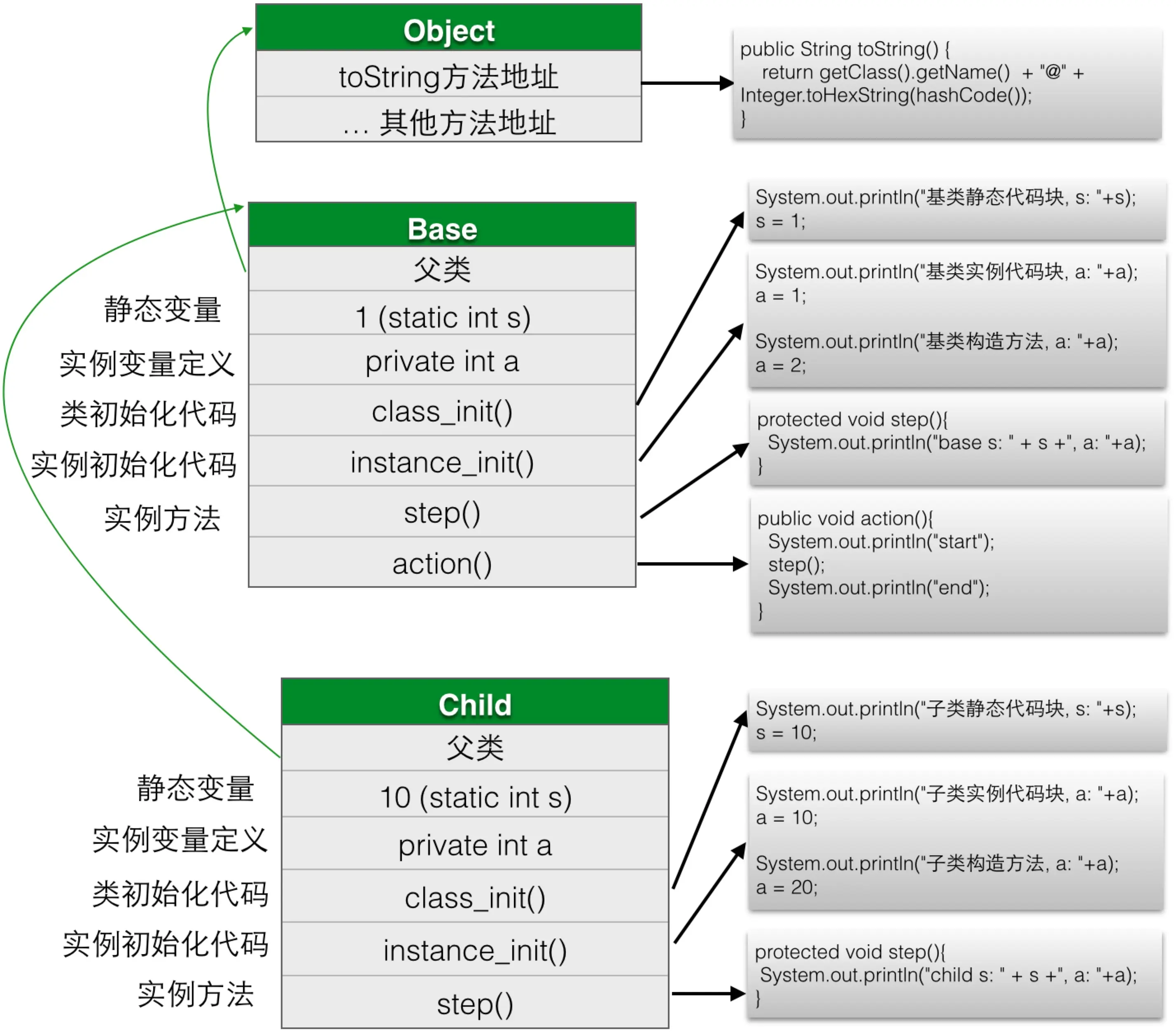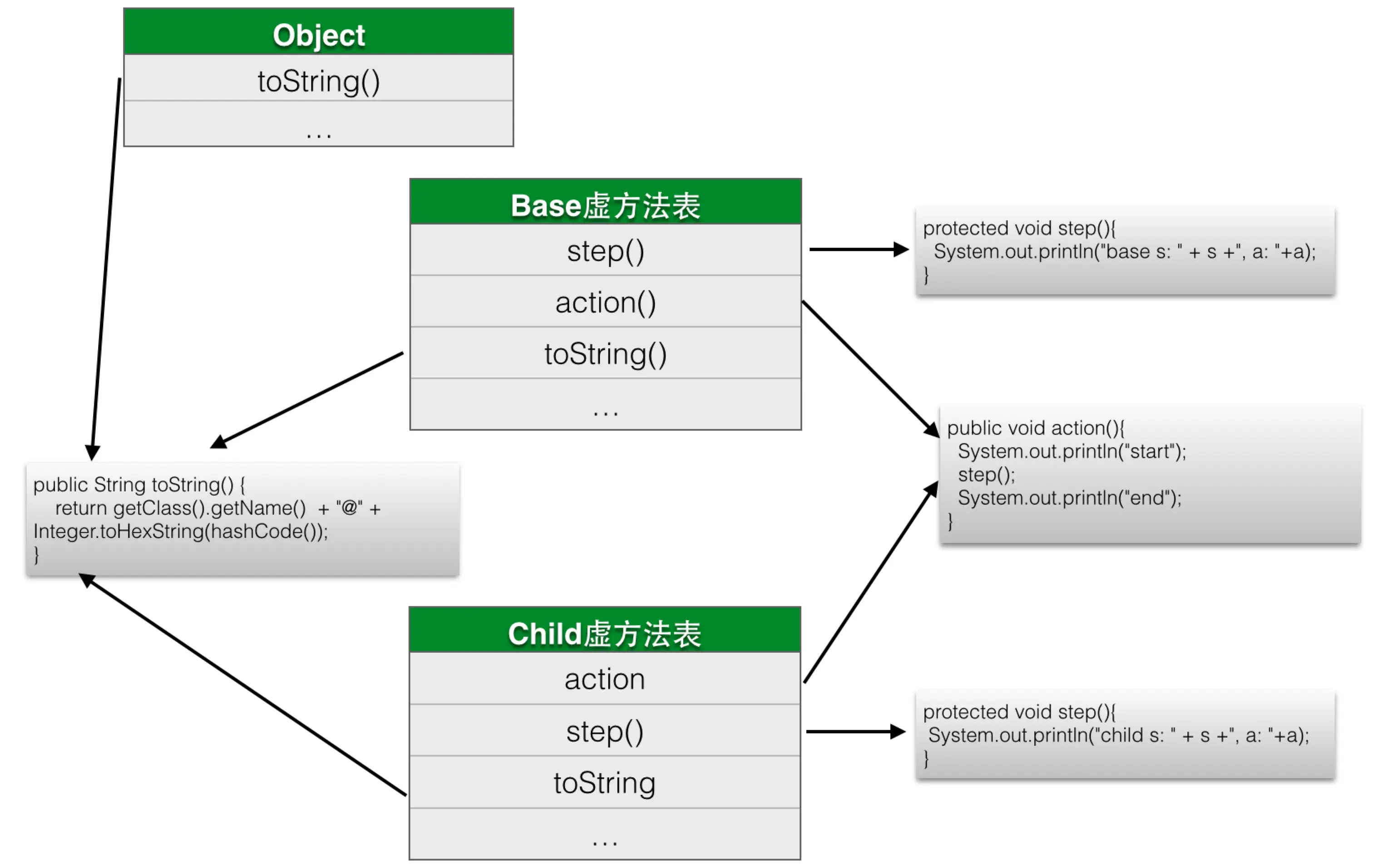 对Child类型来说,action方法指向Base中的代码,toString方法指向Object中的代码,而step()指向本类中的代码。