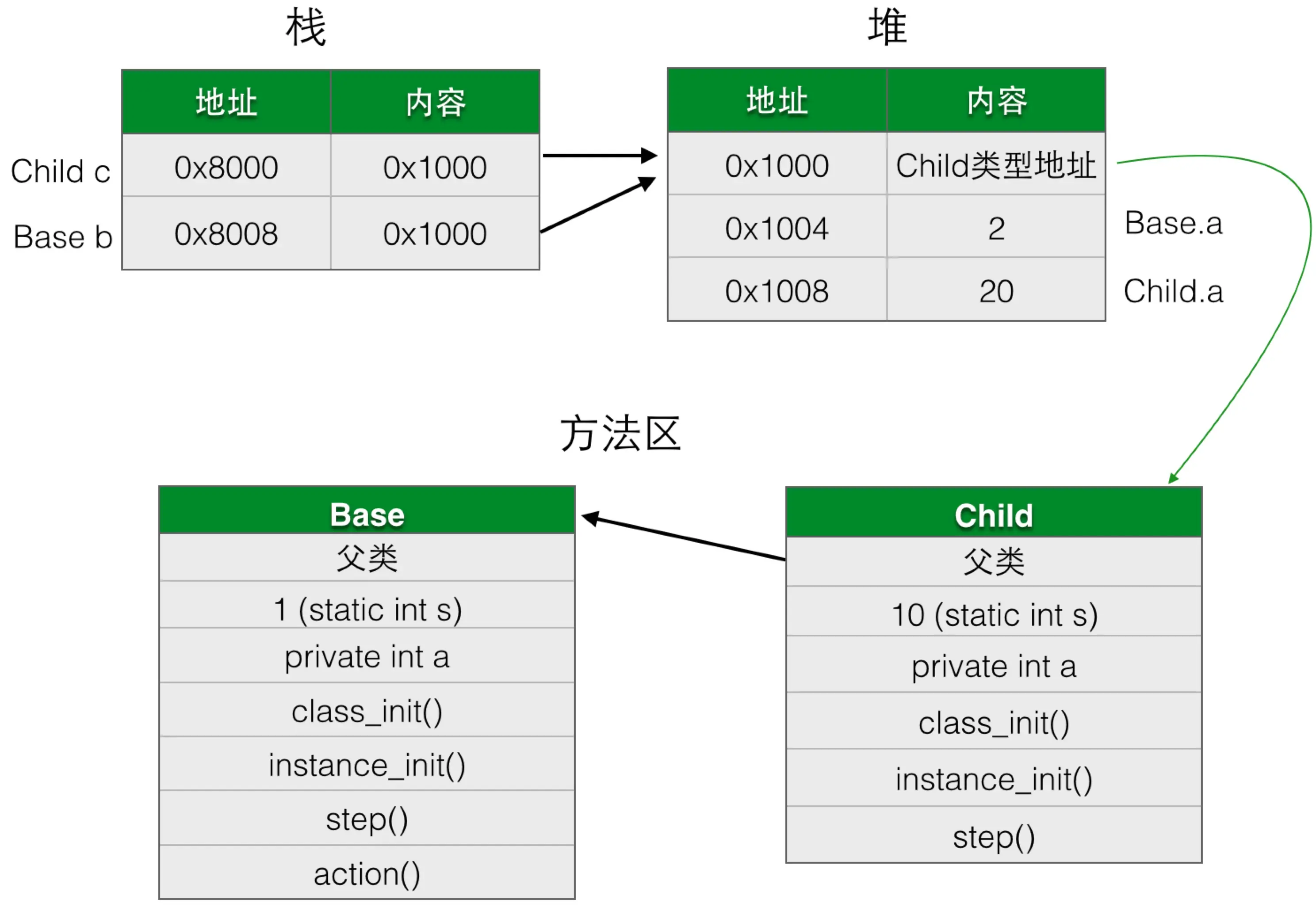 引用型变量c和b分配在栈中,它们指向相同的堆中的Child对象,Child对象存储着方法区中Child类型的地址,还有Base中的实例变量a和Child中的实例变量a。创建了对象,接下来,来看方法调用的过程。
