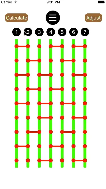 鬼脚图,一种游戏或抽签方法,用于简单的决策,在日本被称为阿弥陀签(あみだくじ)。