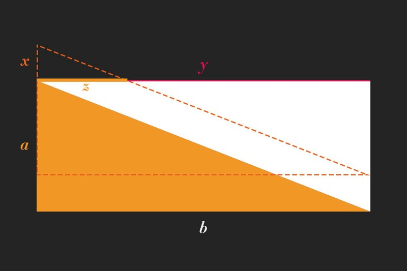 我们将我们的我们让 Indicator 的宽度和 body 等宽(好吧,其实就是 100%,此处这样话会好理解一点),然后,注意到黄色的三角形了吗,当我们向上滚动的时候,黄色的三角形也会跟着向上滚动,同时,它会和长度为 y 的 Indicator 发生交叉,Indicator 会从三角形截出一段距离 z。这时候,黄色三角形向上移动的距离是 x。那么,要达到 Indicator 的效果,我么肯定要满足下面的条件: