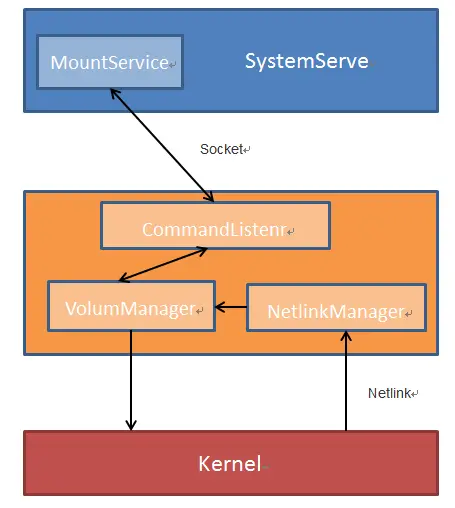 - Vold框架(橙色方块)里面有3个比较重要的组件,分别是:NetlinkManager,VolumeManager,CommandListener.