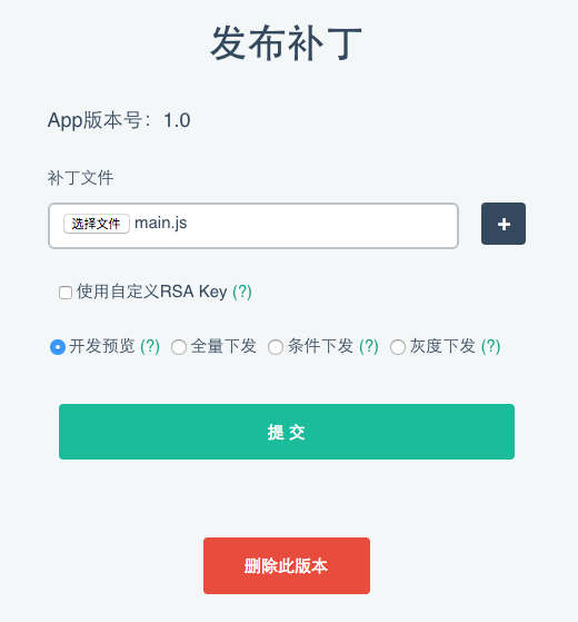 - 添加App版本 是按照你App的Version来创建的(如果version没写对会下载不到补丁)