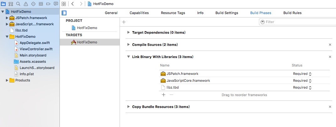 将解压后的SDK直接拖入工程中,然后在TARGETS -> Build Phases -> Link Binary With Libraries -> + 添加 libz.dylib(或libz.tbd) 和 JavaScriptCore.framework。