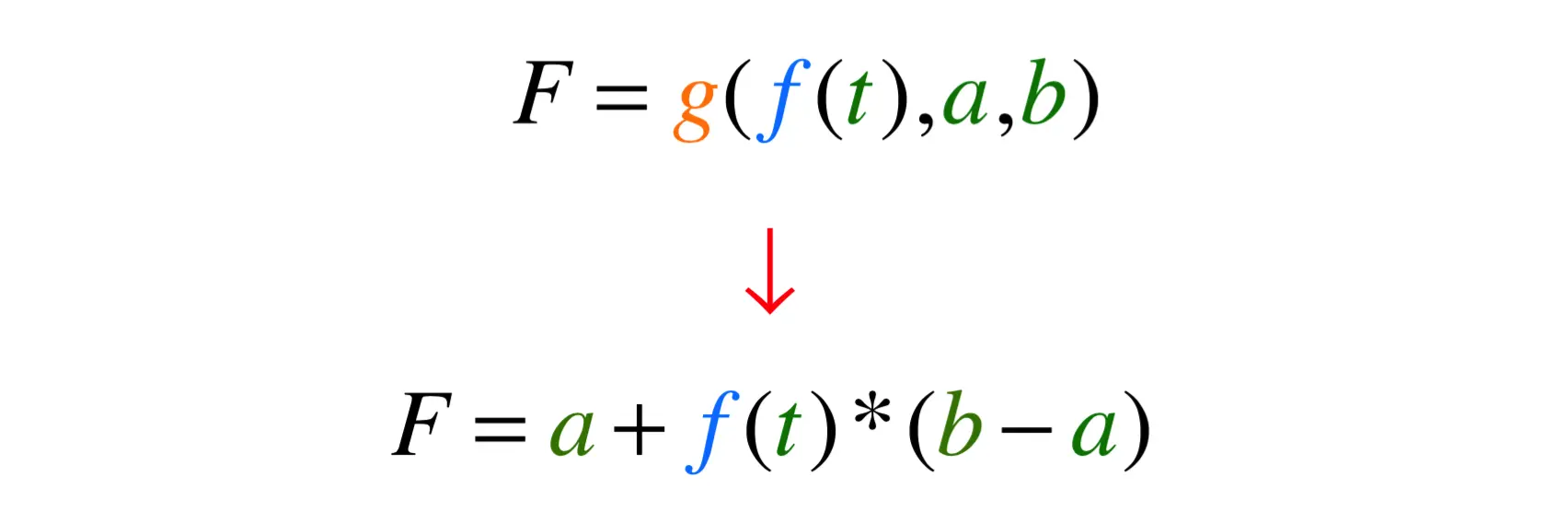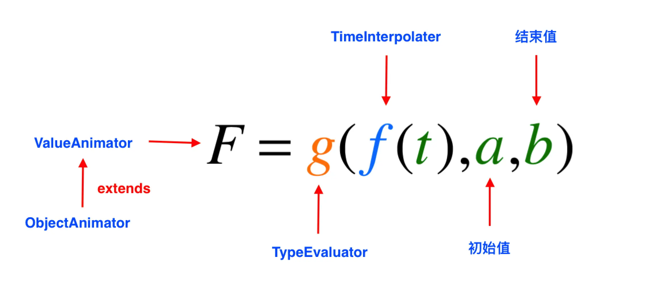 我们主要看一下IntEvaluator的函数实现,通过初始值startInt不断去累加每个时刻属性变化的数值,从而控制对象属性变化最后达到所谓的动画效果。也可以看出TypeEvaluator确实是通过插值器的计算值和开始值以及结束值来实现对动画过程的控制的。同样的到道理,我们也可以通过一个函数表达式来表示TypeEvaluator的工作原理,如下: