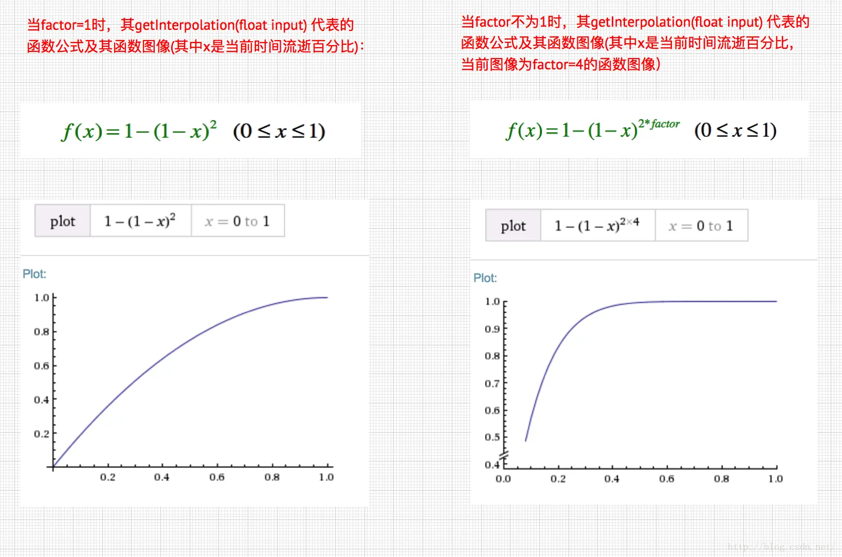 减速插值器,特点开头快,结尾慢,构造函数可以传递一个factor的变量,默认值为1,这个参数同样是个阀值, 用于控制加速的快慢度。当factor为1和不为1时,其getInterpolation(float input)方法代表的函数公式是不同的,且当factor的值越大时,开头就显得越快,当然结尾也就显得越慢了。