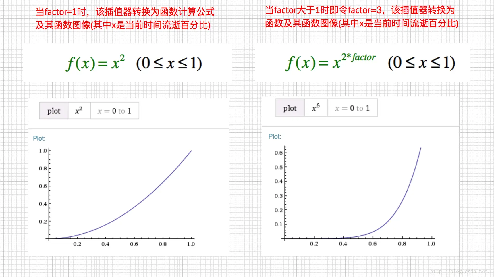 又称加速器插值器,其特点是开始很慢后面越来越快,构造函数可以传递一个factor的变量,默认值为1, 这个参数同样是个阀值,用于控制加速的快慢度,当factor为1和不为1时,其getInterpolation(float input) 代表的函数公式是不同的,且当factor大于1而且越大时,开始加速就越小,但结尾加速更加快。