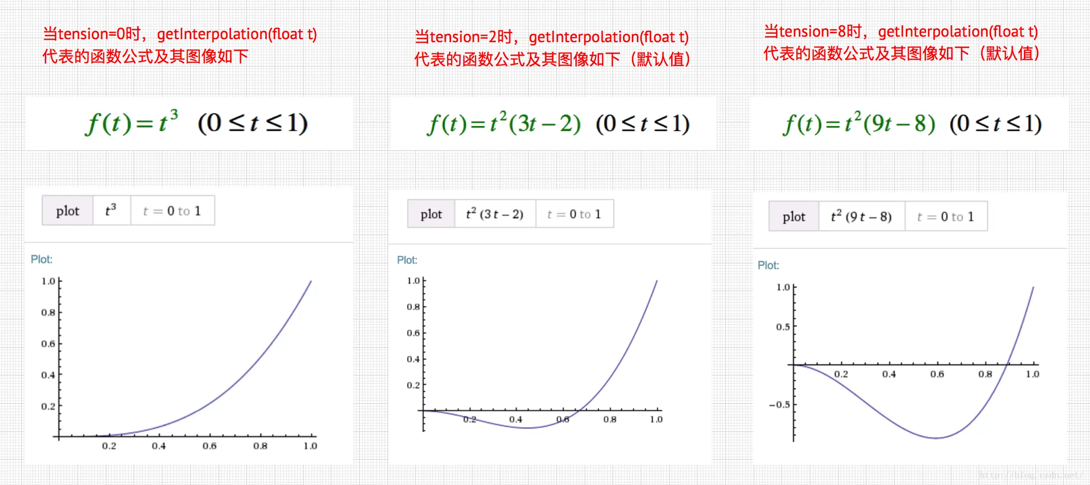 源码中有个变量tension,这个代表是绷紧程度,它大小决定动画开始时反向运动的大小,现在我们分别来看看tension=0,tension=2,tension=8时的函数公式及其图像变换其中tension=2为默认值