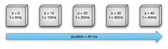 如下图,表示一个匀速的动画,采用的是线性插值器和整型估值器算法,在40ms内,View的x属性值实现从0到40的变换: