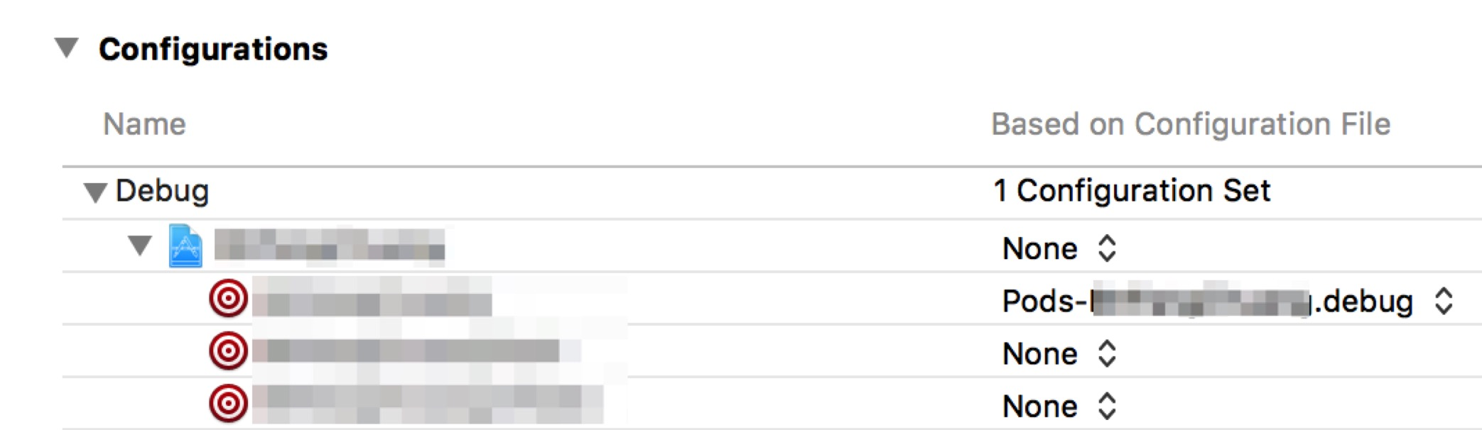 这里我们选择一个Duplicate “Debug” Configuration,因为我们新的环境需要debug,添加完了之后就会多了一套Configuration了,这一套其实是包含了一些编译参数的配置集合。如果此时项目里面有cocopods的话,打开Configuration Set就会发现是如下的样子: