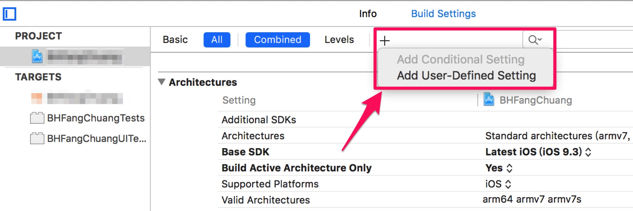 再次回到Project的Build Settings里面来,Add User-Defined Setting。