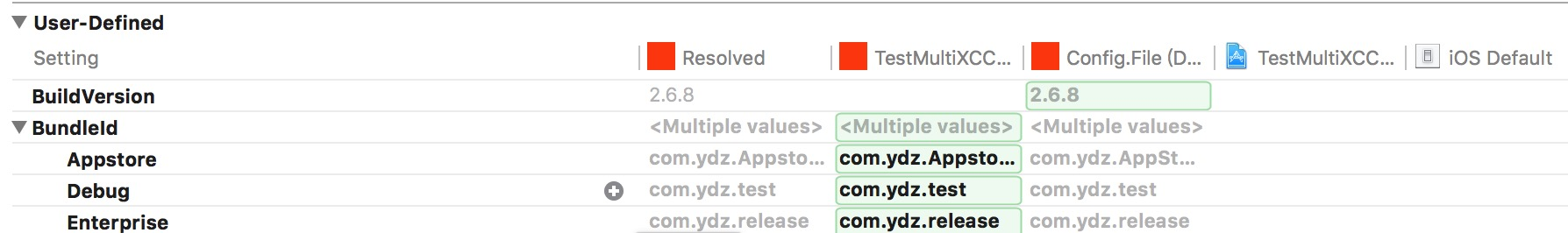 我们目前可以看到有5个配置,他们是有优先级的。优先级是从左往右,依次降低的。Resolved = target-level > project-level > 自定义配置文件 > iOS 默认配置。左边第一列永远显示的是当前生效的最终配置结果。