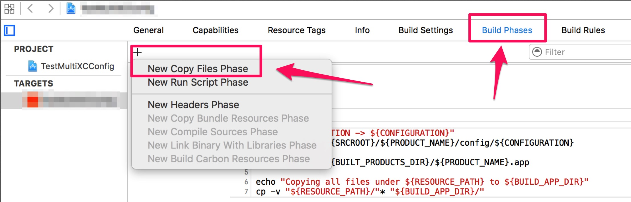 进入到我们的Target里面,找到Build Phases,我们新建一个New Copy Files Phase,并且重命名为Copy Configuration Files。