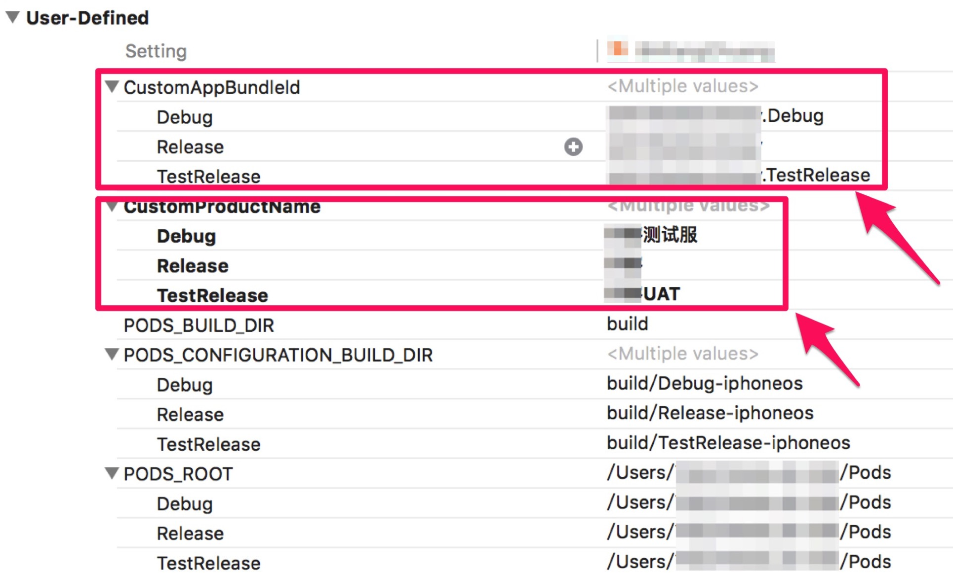 这里值得提到的一点是,下面Pods的Build_DIR这些目录其实是Pods自己生成好的,之前执行过Pod install 之后,这里默认都是配置好的,不需要再改动了。
