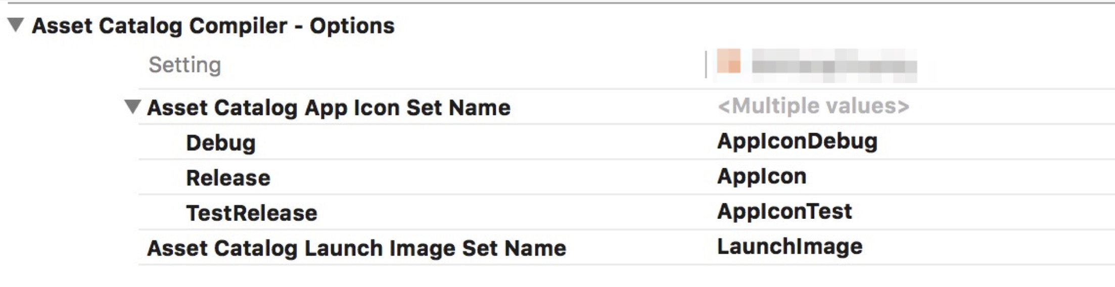 新建完AppIcon之后,再在Build Setting里面找到Asset Catalog Compiler里面,然后把这几种模式下的App Icon set Name分别设置上对应的图标。如上图。