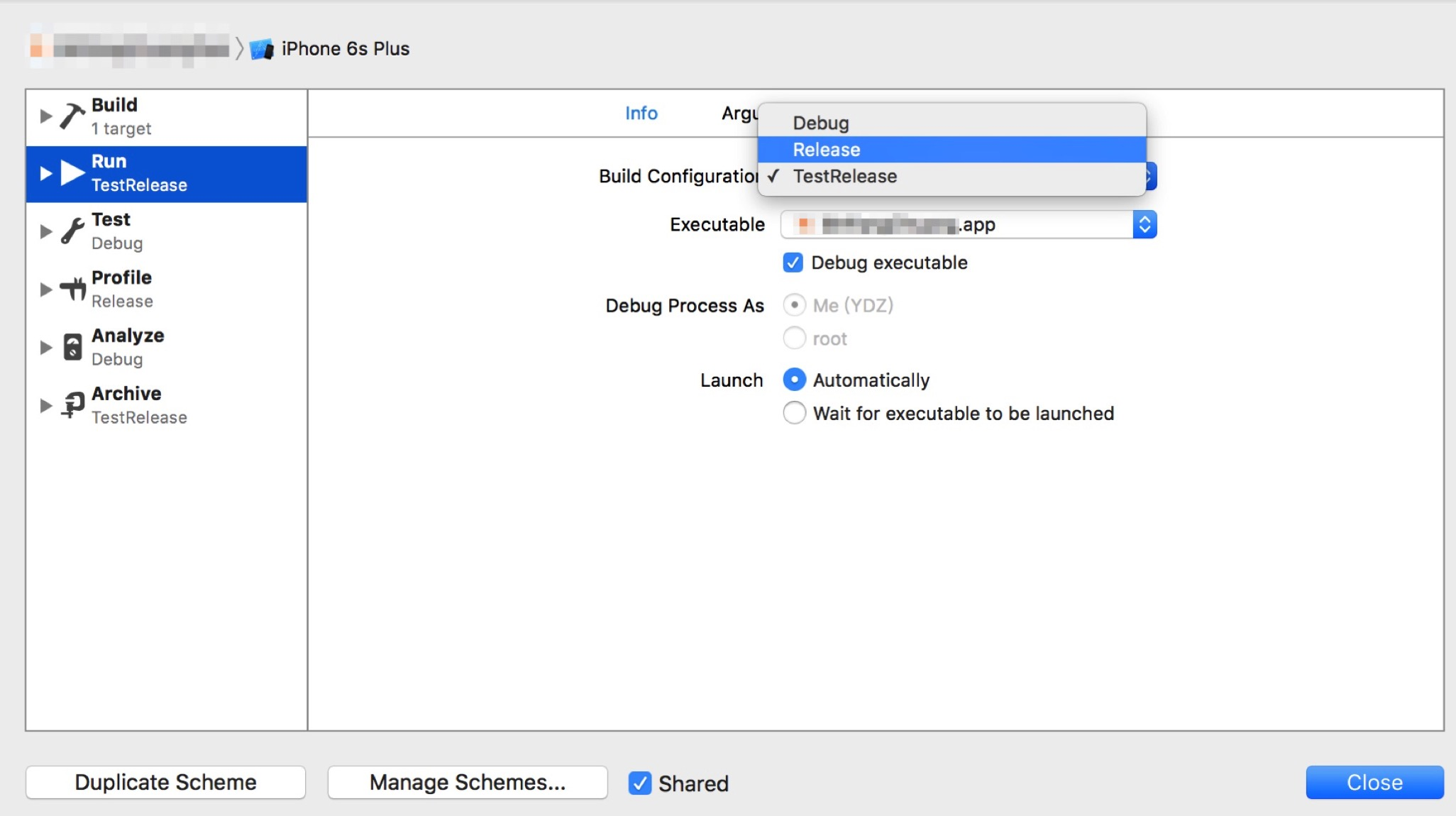 新建完成之后,我们就可以编辑刚刚新建的Scheme,这里可以把Run模式和Archive都改成新建Scheme。如下图: