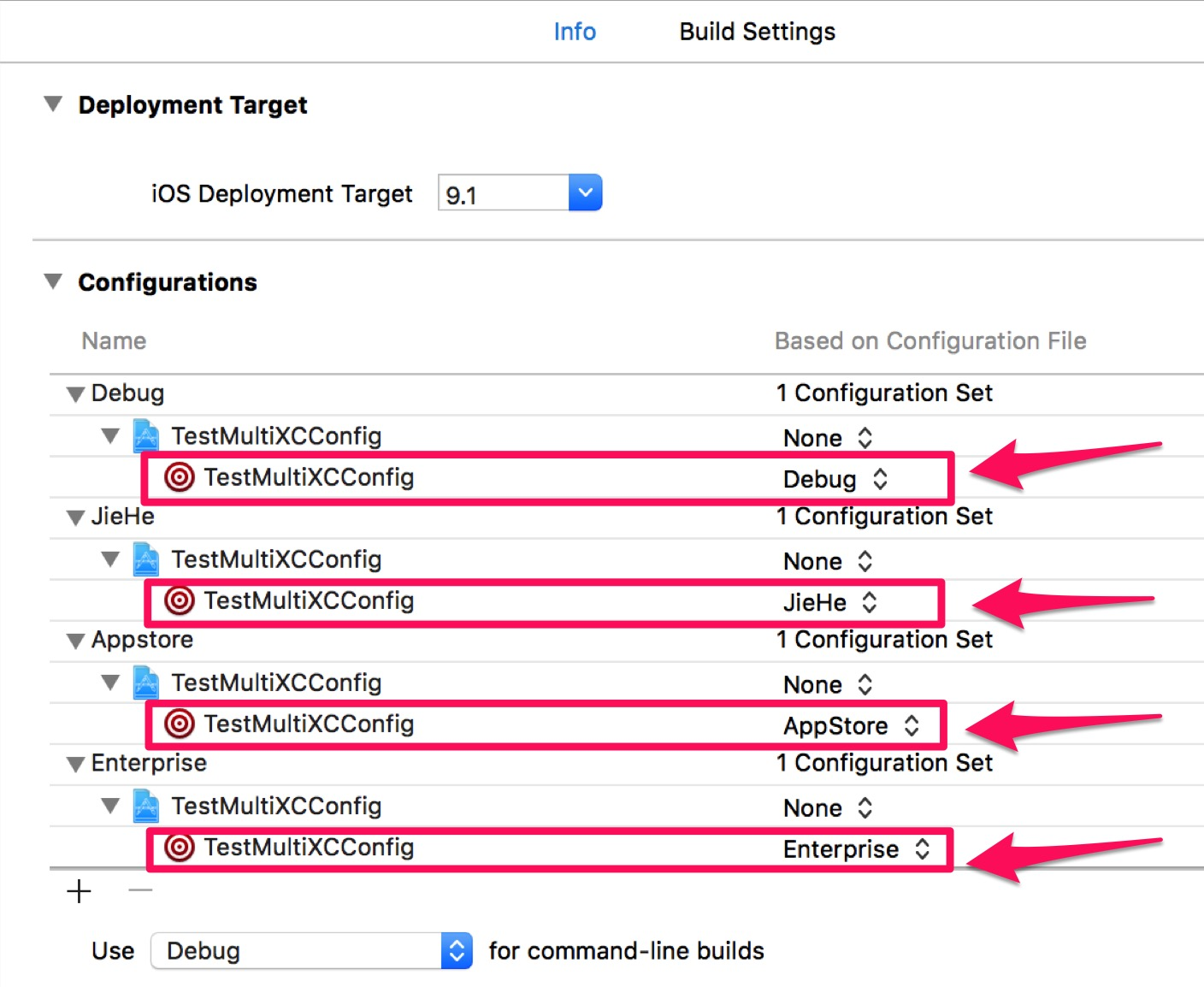 xcconfig 我们可以写入不同的 Configuration 选项配置不同的文件。每一个 xcconfig 可以配置 Build Settings 里的属性值, 其实实质就是通过 xcconfig 去修改 GCC_PREPROCESSOR_DEFINITIONS 的值,这样我们就可以做到动态配置环境的需求了。
