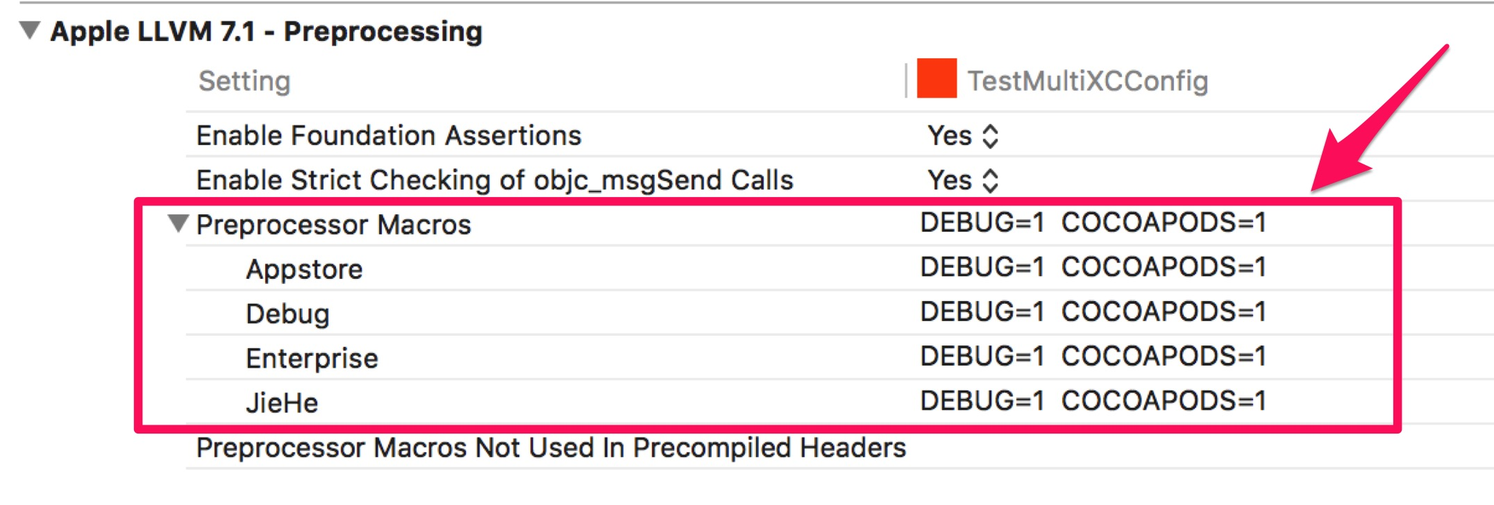 Preprocessor Macros 其实是按照 Configuration 选项进行默认配置的, 它是可以根据不同的环境预先制定不同定义的宏,或者为不同环境下的相同变量定义不同的值。