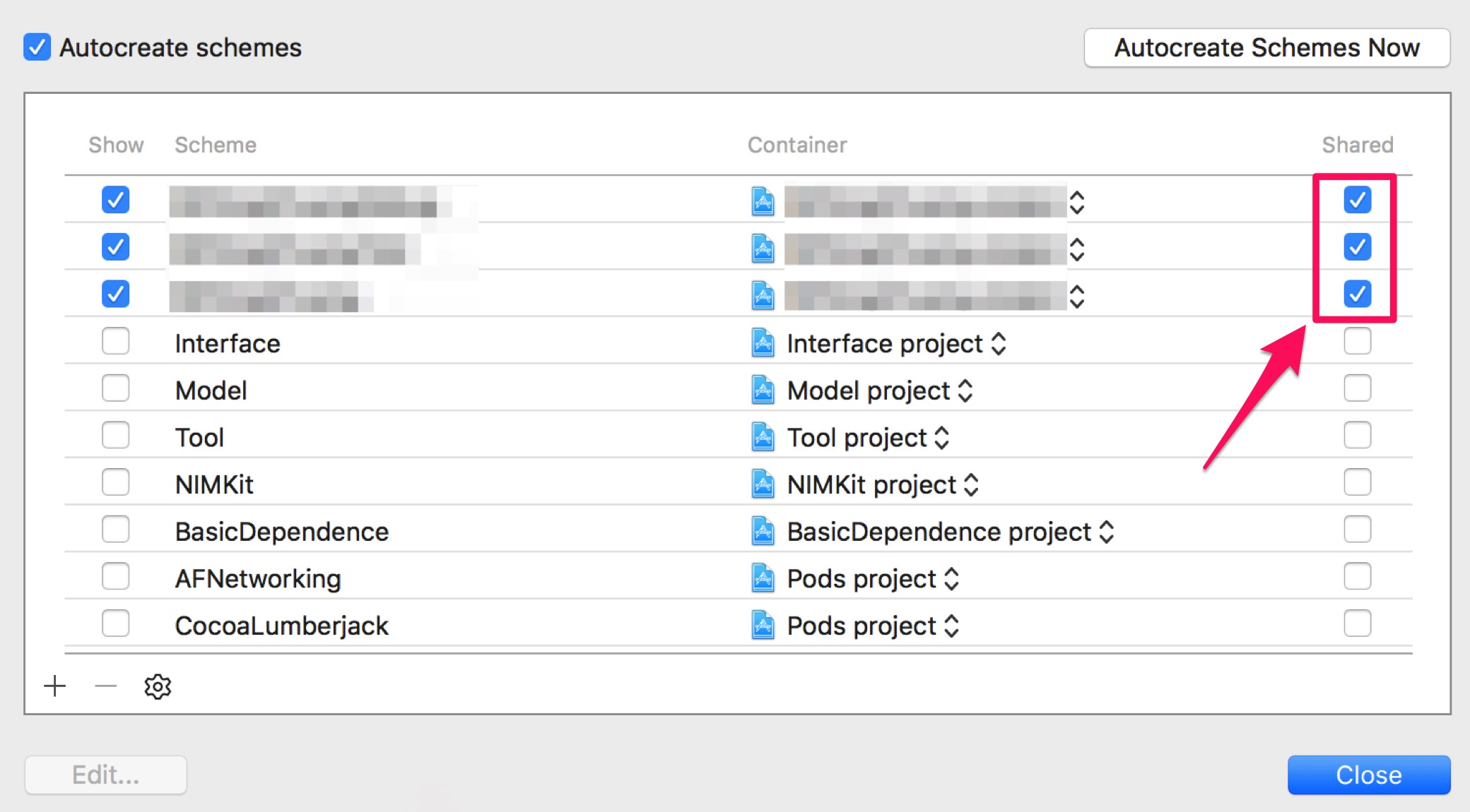 注意:如果是使用了Git这些协同工具的同学这里还需要把刚刚新建的Scheme共享出去,否则其他人看不到这个Scheme。选择“Manage Schemes”